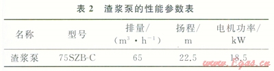 將rp=4.8g/cm3、Vp=6m3/h、rn=1.1g/cm3、C=30%代入公式(5)得到:Q=61m3/h。實(shí)際使用的渣漿泵的排量為65m3/h。性能參數(shù)如表2所示。