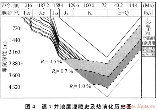 通過熱演化史的恢復(fù),可以分析烴源巖進(jìn)入生烴門限的時(shí)期,確定主要生烴時(shí)期。由于熱演化史主要決定于古地溫和受熱時(shí)間。因此,在熱演化史的恢復(fù)時(shí),首先要進(jìn)行古埋藏史恢復(fù),然后才能通過TTI值法計(jì)算熱演化史。根據(jù)鉆井地層分層資料和聲波測井資料,求出每一層在不同埋深下的厚度,恢復(fù)出通7井的地層埋藏史(圖4)。