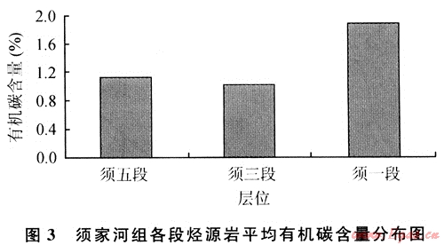 在分析的80個(gè)樣品中,有機(jī)碳含量的變化范圍為0.51%~7.12%,平均為1.47%。其中須一段有機(jī)碳含量為j.51%~7.12%,平均值1.87%;須三段為0.53%~1.80%,平均值1.02%;須五段為0.54%~2.48%,平均值1.12%(圖3)??梢钥闯鲰毤液咏M各層段烴源巖的平均有機(jī)碳含量都在生烴門限值以上,根據(jù)上述烴源巖有機(jī)碳豐度評價(jià)標(biāo)準(zhǔn),結(jié)合所分析的樣品來看,川中-川南過渡帶上三疊統(tǒng)須家河組烴源巖總體上屬于較好-中等烴源巖,具有一定的生烴物質(zhì)條件基礎(chǔ)。