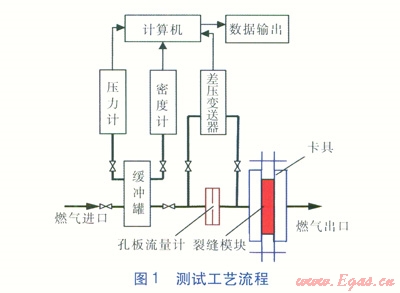 測試實驗前,對測試實驗整個系統(tǒng)進行吹掃置換,使系統(tǒng)符合燃?xì)膺\行條件。將低壓燃?xì)庖?span lang="EN-US">2m3緩沖罐中,燃?xì)膺M入此緩沖罐靜置一段時間后,其溫度、壓力及密度處于相對穩(wěn)定狀態(tài)。測試開始后,由緩沖罐所連接的壓力計與密度計測量燃?xì)鈮毫εc密度,并將測量數(shù)據(jù)連續(xù)傳輸給計算機。計算機接收數(shù)據(jù)信號后,計算出未修正前的燃?xì)饬鹘?jīng)裂縫模塊的理論流量q0。同時燃?xì)饨?jīng)孔板流量計、卡具內(nèi)裂縫模塊流至室外大氣中。在此期間,孔板流量計兩側(cè)由燃?xì)鈱?dǎo)壓管相連接的差壓變送器同時獲取燃?xì)獠顗簲?shù)據(jù)信號,并傳輸給計算機,由計算機編程計算出此刻流經(jīng)裂縫模塊的燃?xì)庑孤嶋H流量q0。最后計算機計算輸出燃?xì)饬髁啃拚禂?shù)K(K=qv/q0),完成整個測試實驗。