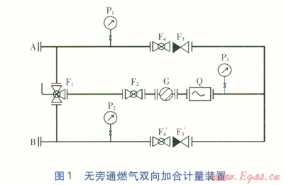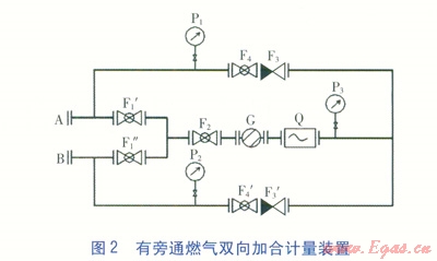 同理,可實(shí)現(xiàn)燃?xì)鈴?span lang="EN-US">B端單向流向A端并計(jì)量的目標(biāo)。當(dāng)過(guò)濾器G、流量計(jì)Q有問(wèn)題或需清洗維修時(shí),可打開(kāi)旁通球閥F1¢讓燃?xì)馔ㄟ^(guò),以保證加合計(jì)量裝置燃?xì)鈶?yīng)急流動(dòng)的連續(xù)性。