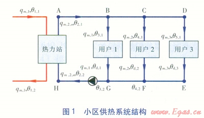 小區(qū)供熱系統(tǒng)結構見圖l。小區(qū)供熱系統(tǒng)劃分為3個部分:熱力站、二級管網(wǎng)、用戶。