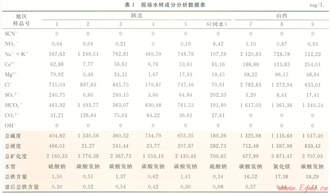 將現(xiàn)場所取回的2個區(qū)塊的8個水樣和1個壓裂液配水樣品進行常規(guī)水質分析[5],同時進行了SCN-[6]和NO3-[7]的檢測。實驗結果如表l所示。