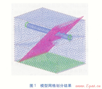 斷層是土體之發(fā)生相對(duì)位移的破裂面,斷盤(pán)指斷層兩側(cè)的巖土,位于斷層之上的稱(chēng)為上盤(pán),斷層之下的稱(chēng)為下盤(pán)。將斷層運(yùn)動(dòng)考慮為其中一盤(pán)相對(duì)靜止,另一盤(pán)相對(duì)該盤(pán)運(yùn)動(dòng),將約束加在相對(duì)不動(dòng)的一盤(pán)上。設(shè)定上盤(pán)為運(yùn)動(dòng)盤(pán),下盤(pán)為相對(duì)靜止盤(pán)。重力荷載直接加到整個(gè)模型上,方向垂直向下;位移荷載加到上盤(pán),方向沿?cái)鄬觾A角斜向下;地震力集中作用到上盤(pán)。模型網(wǎng)格劃分結(jié)果見(jiàn)圖1,管道選用8節(jié)點(diǎn)網(wǎng)格,土體選用4節(jié)點(diǎn)網(wǎng)格。
