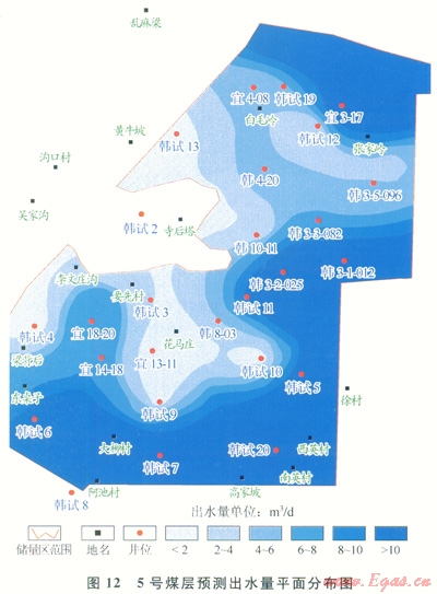 基于煤層氣排采出水量預(yù)測(cè)結(jié)果,編繪了研究區(qū)5號(hào)煤層含水性平面分布特征圖(圖12)。由該圖可知,5號(hào)煤層南部和北部及中部韓3-2-025井區(qū)出水量較大,呈現(xiàn)沿?cái)嗔褞А?gòu)造低幅度區(qū)及頂?shù)装搴駥由皫r區(qū)出水量增大的趨勢(shì)。