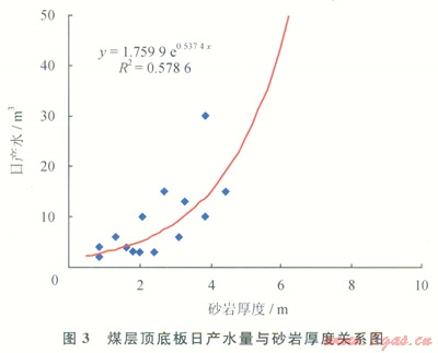 煤層直接頂?shù)装鍨樯皫r時(shí),物性較好,且砂巖厚度越大,則頂?shù)装迳皫r的含水性越強(qiáng),煤層壓裂后頂?shù)装迳皫r的地層水易于產(chǎn)出,排采出水量亦較大。如果砂巖為老頂?shù)?,但直接頂?shù)装宓哪鄮r較薄,壓裂時(shí)容易壓穿直接頂?shù)装宓哪鄮r,致使壓裂縫溝通了老頂?shù)椎纳皫r而增大出水量,且隨著砂巖距煤層越近,越易于壓穿直接頂而溝通砂巖含水層,為此,頂?shù)装迳皫r的厚度、孔隙度及距煤層的距離與煤層排采出水量有較大的關(guān)系。