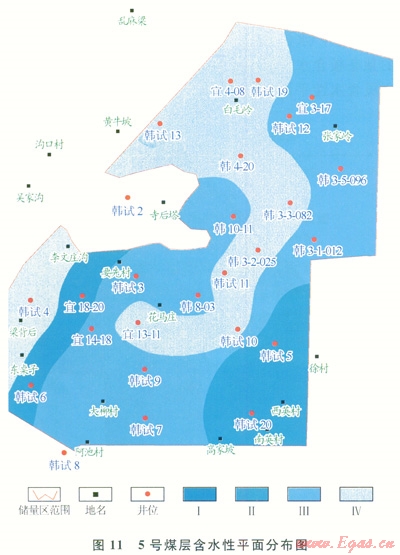 基于煤層自身產(chǎn)水量測(cè)井預(yù)測(cè)結(jié)果及上述劃分標(biāo)準(zhǔn),編繪了5號(hào)煤層含水性平面分布圖(圖11)。由圖11可知,5號(hào)煤東南部韓試5、韓試20井區(qū),及西南部宜18-20、韓試6井區(qū)含水性較強(qiáng),其他區(qū)域則相對(duì)較弱。