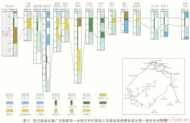 盆地北緣川北、陜南地區(qū)大致以漢南古陸為中心向其周緣,“碎屑巖層”由濱岸相石英砂巖相變?yōu)殛懪锵嗟纳百|(zhì)泥巖、盆地相的黑色頁巖與硅質(zhì)巖。緊鄰漢南古陸的南鄭縣梁山鎮(zhèn)地區(qū)以石英砂巖為主,自漢南古陸向西側(cè),勉縣紙房溝為石英砂巖夾砂質(zhì)泥巖,寧強縣胡家壩鎮(zhèn)地區(qū)為藍灰—紫紅色頁巖、泥質(zhì)云巖、黑灰色頁巖夾石英砂巖,寧強縣滴水鋪鄉(xiāng)地區(qū)為灰綠色砂質(zhì)頁巖,寧強縣雙河鄉(xiāng)地區(qū)為藍灰色砂質(zhì)云巖,廣元陳家壩相變?yōu)樯百|(zhì)頁巖,再往西到青川關(guān)莊等地則遭受剝蝕而缺失該套地層;自漢南古陸向東側(cè),南江楊壩為石英砂巖與深灰色泥巖,南鄭白玉河、西鄉(xiāng)司上為含泥質(zhì)云巖,鎮(zhèn)巴涇洋為次生角礫云巖(圖2)。