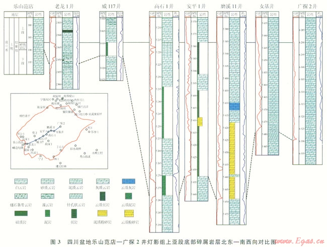 盆地南緣及川中地區(qū)主要以藍灰色泥巖、深灰色泥巖為主,并夾石英砂巖。峨邊先鋒為深灰色、黑色泥巖,樂山范店為泥質(zhì)云巖,老龍l井為深灰、黑灰色硅質(zhì)巖、泥質(zhì)云巖與頁巖,窩深l井、宮深l井為泥質(zhì)云巖,威117井為黑色、藍灰色泥巖,高石1井、安平l井為黑色頁巖夾薄層泥質(zhì)云巖,磨溪11井為石英細(xì)砂巖,到女基井為砂質(zhì)云巖(圖3)。