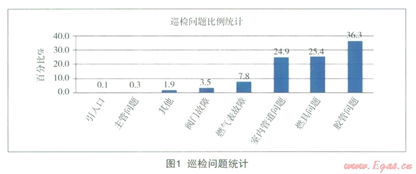 北京市燃?xì)饧瘓F(tuán)從2007年5月開(kāi)始進(jìn)行第一期全面巡檢,每期持續(xù)l8個(gè)月,至今已進(jìn)行2.5期巡檢,居民戶內(nèi)安全巡檢內(nèi)容包括:戶內(nèi)燃?xì)夤艿篮蛻魞?nèi)燃?xì)庠O(shè)備的安裝情況是否符合規(guī)范、外觀狀況如何、設(shè)備是否正常、是否有泄漏等。如果發(fā)現(xiàn)異常,能現(xiàn)場(chǎng)維修事項(xiàng)進(jìn)行維修,不能現(xiàn)場(chǎng)維修事項(xiàng)實(shí)施維修工作程序,或者啟動(dòng)緊急搶修程序,或者向用戶發(fā)放“居民用戶巡檢告知單”。本文取第二期(自2008年12月至2010年4月)安全巡檢數(shù)據(jù)進(jìn)行分析。第二期巡檢入戶率約為53.31%,其問(wèn)題統(tǒng)計(jì)1如圖l所示。