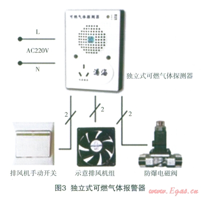 單一報(bào)警功能的報(bào)警器:它能在傳感器周圍燃?xì)鉂舛冗_(dá)到一定數(shù)值時(shí)嗚叫或者發(fā)光報(bào)警,提示家庭用戶及時(shí)采取措施。這種報(bào)警器的特點(diǎn)是價(jià)格較低,安裝簡(jiǎn)便,無(wú)需改造燃?xì)庀到y(tǒng),因此適用于老舊小區(qū)。另一類為帶信號(hào)輸出功能的報(bào)警器,如圖3所示。這種報(bào)警器可以驅(qū)動(dòng)電磁閥在報(bào)警的同時(shí)及時(shí)切斷燃?xì)馔ǖ?,或者控制排風(fēng)扇、抽油炯機(jī)強(qiáng)制排風(fēng),但其安裝相對(duì)復(fù)雜。