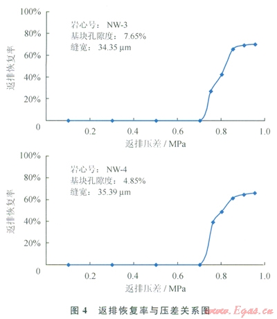 考慮原地條件下鉆井完井液損害評(píng)價(jià),結(jié)果更真實(shí)地反映煤層的損害程度[15-16]。筆者采用滲透率恢復(fù)實(shí)驗(yàn)評(píng)價(jià)鉆井完井液對(duì)煤樣滲流能力的影響,評(píng)價(jià)時(shí)將巖心被鉆井完井液動(dòng)態(tài)循環(huán)反向損害后正向測(cè)得的滲透率與損害前正向測(cè)得的巖心滲透率進(jìn)行對(duì)比,得到的比值稱為滲透率返排恢復(fù)率。返排恢復(fù)率越高,表明鉆井完井液對(duì)煤層滲流通道的損害越弱。實(shí)驗(yàn)結(jié)果見(jiàn)圖4,兩塊滲透率級(jí)別相近煤樣都在較小壓差下就能突破濾餅,隨著壓差的不斷增大,煤樣的滲透率返排恢復(fù)率可達(dá)70%,表明鉆井完井液固相引起的滲透率降低程度較弱。
