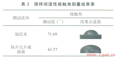 煤巖具有較大的表面積,使其具有較高的吸附各種流體及氣體的能力。鉆井完井液濾液中包含一些表面活性劑,當(dāng)鉆井完井液濾液侵入煤層后,將在煤巖表面吸附進(jìn)而改變煤巖的潤(rùn)濕性。運(yùn)用接觸角測(cè)量?jī)x對(duì)地層水與鉆井完井液濾液在煤巖表面的潤(rùn)濕角進(jìn)行了測(cè)量(表2),可見(jiàn)地層水的潤(rùn)濕角大于鉆井完井液的潤(rùn)濕角,亦就是鉆井完井液在煤巖表面的潤(rùn)濕性強(qiáng)于地層水,導(dǎo)致鉆井完井液更容易吸附于煤巖表面。
