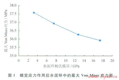 在以往關(guān)于蠕變地應(yīng)力對(duì)封固系統(tǒng)受力狀態(tài)影響的研究中,建立的封固系統(tǒng)模型通常包括套管、水泥環(huán)和地層3個(gè)部分,將蠕變地應(yīng)力施加于地層外側(cè)[19-20]。工程實(shí)際中,蠕變地應(yīng)力最終直接作用于水泥環(huán)上[15],與上述建立的模型有所差別。本研究根據(jù)工程實(shí)際情況,建立的封固系統(tǒng)模型只包括套管和水泥環(huán)兩部分,將蠕變地應(yīng)力直接施加于水泥環(huán)外側(cè)。井眼直徑取為215.9mm,套管內(nèi)外徑分別取為l57.1mm和177.8mm,套管楊氏模量及泊松比分別取為210GPa和0.26,水泥環(huán)泊松比取為0.19,變化水泥環(huán)楊氏模量分別為3.32GPa(水泥漿密囊1.57g/cm3,無圍壓,抗壓強(qiáng)度16.4MPa)、7.49GPa(水泥漿密度1.79g/cm3,無圍壓,抗壓強(qiáng)度21.2MPa)、l2.73GPa(水泥漿密度1.85g/cm3,圍壓5MPa,抗壓強(qiáng)度27.1MPa)、17.45GPa(水泥漿密度1.9g/cm3,圍壓20MPa,抗壓強(qiáng)度34.3MPa)。一界面和二界面處的初始擠壓應(yīng)力分別設(shè)為2MPa和3MPa,蠕變地應(yīng)力取為40MPa。利用ANSYS軟件建模和計(jì)算封同系統(tǒng)中的應(yīng)力,選擇Von Mises準(zhǔn)則汁算得到水泥環(huán)中的最大應(yīng)力(位于水泥環(huán)內(nèi)側(cè))(圖1)。