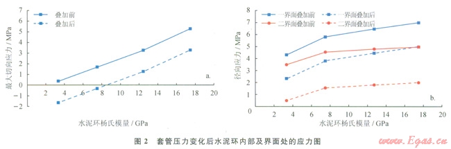 由圖4-a圖看出,水泥環(huán)內(nèi)的最大Von Miscs應(yīng)力隨水泥環(huán)楊氏模量的增大而增大;與初始應(yīng)力替加后,Von Mises應(yīng)力增大為4.4~8.0MPa,小于普通水泥環(huán)的屈服強(qiáng)度。所以,當(dāng)溫度變化幅度不大時(shí),水泥環(huán)通常不會(huì)發(fā)生屈服破壞,但溫度升高幅度較大時(shí)水泥環(huán)可能會(huì)發(fā)生屈服破壞。因此,對(duì)熱采井等應(yīng)避免使用膨脹水泥漿,且應(yīng)使用低楊氏模量的水泥環(huán)。由圖4-b可以看出,與初始應(yīng)力疊加前,一、二界面在徑向上受拉伸應(yīng)力的作用且應(yīng)力隨水泥環(huán)的楊氏模量增大而增大,為4.4~8.0MPa,遠(yuǎn)大于一、二界面膠結(jié)的抗拉強(qiáng)度,會(huì)破壞一、二界面膠結(jié);與初始應(yīng)力疊加后,徑向應(yīng)力顯著降低至1.4~6.0MPa,降低了一、二界面膠結(jié)破壞的風(fēng)險(xiǎn)。因此,通過降低水泥環(huán)楊氏模量和增大初始應(yīng)力都可以降低界面膠結(jié)破壞的風(fēng)險(xiǎn),建議采用較低楊氏模量的水泥環(huán)或使用膨脹水泥來預(yù)防失效。
