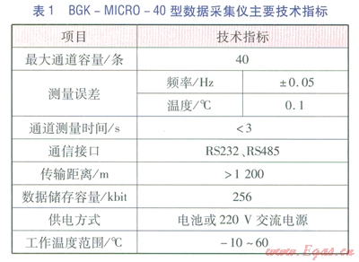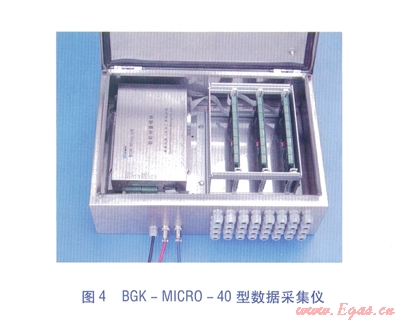 BGK-ICR0-40型數(shù)據(jù)采集儀見圖4,主要技術(shù)指標(biāo)見表l。BGK-MICR0-40型數(shù)據(jù)采集儀主要功能為:遠(yuǎn)程控制和數(shù)據(jù)采集功能。現(xiàn)場操作功能:預(yù)留有與便攜式計算機的接口,可實現(xiàn)現(xiàn)場標(biāo)定、調(diào)試以及數(shù)據(jù)采集等功能。實時時鐘管理:為定時測量、自動儲存等功能提供時間基準(zhǔn)。斷電保護(hù):所有參數(shù)和監(jiān)測數(shù)據(jù)儲存在專用非易失性儲存器中,可確保斷電后參數(shù)和數(shù)據(jù)的安全??估讚簦涸陔娫聪到y(tǒng)、通信線路接口、模擬輸入引線等處設(shè)置了有效的抗雷擊電路??闺姶鸥蓴_:模塊采用金屬盒封裝,在電路設(shè)計上對通信接口采用光電隔離技術(shù),具備很強的抗電磁干擾能力。智能化測量功能:可根據(jù)要求實現(xiàn)定點測量、定時測量、即時測量等多種測量方式。多種供電方式:可實現(xiàn)電池及220V交流電源供電,內(nèi)置可充電免維護(hù)電池,保證在外部供電中斷情況下繼續(xù)正常運行168h以上。