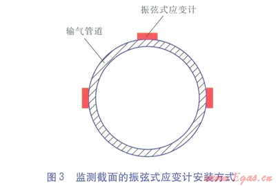 目前國內(nèi)外比較先進(jìn)的管道應(yīng)變傳感器主要包括振弦式應(yīng)變計、FBG光纖光柵應(yīng)變計、GFRP分布式應(yīng)變傳感光纜。VK-4150型振弦式應(yīng)變計見圖2。監(jiān)測截面的振弦式應(yīng)變計安裝方式見圖3。監(jiān)測截面指輸氣管道上安裝了振弦式應(yīng)變計的一個受測截面,每個監(jiān)測截面安裝3支振弦式應(yīng)變計,呈品字形安裝的3支振弦式應(yīng)變計足以計算出管道在該截面圓周上任意一點的應(yīng)變量。沿管道軸向間隔20m左右設(shè)1個監(jiān)測截面,一個監(jiān)測截面的造價約1.5×104元。