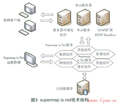 G1S的數(shù)據(jù)庫是以圖形為基礎(chǔ),根據(jù)不同的要求有不同的數(shù)據(jù)結(jié)構(gòu)[10]。本文采用supermap組建來實現(xiàn)燃氣管道風(fēng)險水平的可視化。supermap是一個標準的控件GIS產(chǎn)品,可以在多種語言上使用。Supermap中deskpro是一套運行在桌面端的專業(yè)GIS軟件,提供了地圖編輯、屬性數(shù)據(jù)管理、分析與決策輔助事務(wù)處理、地圖輸出、報表打印、三維建模等方面的功能。supermap is.net是新一代網(wǎng)絡(luò)地理信息系統(tǒng)開發(fā)平臺,supemlap is.net由客戶端用戶界面表現(xiàn)組件、web服務(wù)器擴展、GIS服務(wù)器、數(shù)據(jù)服務(wù)器以及遠程管理器等多個組件組成,如圖3所示[11-13]。