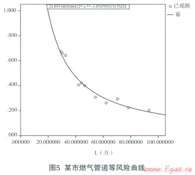 (2)對上述數(shù)據(jù)用回歸分析法進行擬合,可得該城市的等風(fēng)險曲線,如表1和圖5所示,運算結(jié)果為R=P*L=24.765,即該城市燃氣管道風(fēng)險值為24.765。