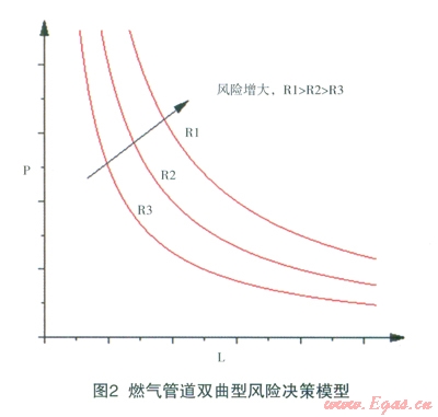 由風(fēng)險計算公式R=pxl可知燃氣管道事故發(fā)生的概率和可能造成的經(jīng)濟損失呈倒冪數(shù)關(guān)系,因此回歸方程即為R=pxl。用回歸分析法進行相關(guān)分析,然后計算預(yù)測誤差,最后確定燃氣管道的風(fēng)險值,即可得到該城市的風(fēng)險曲線,每段燃氣管道的風(fēng)險值與此比較,判斷其風(fēng)險可接受性,即可建立雙曲型風(fēng)險決策模型如下圖2所示,其中P表示燃氣管道事故發(fā)生的概率,L表示燃氣管道事故發(fā)生造成的損失。