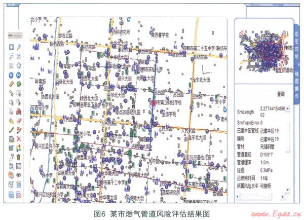(4)實現(xiàn)燃氣管道風(fēng)險水平的可視化。首先得到該市的燃氣管道的柵格圖像,經(jīng)轉(zhuǎn)換成矢量數(shù)據(jù)并作適當處理后存入supermap deskpro。將燃氣管道的基本信息及風(fēng)險水平等相關(guān)數(shù)據(jù)導(dǎo)入supermap deskpro,再使用supermap is.net將相關(guān)數(shù)據(jù)顯示出來,可以使用查詢條件查詢?nèi)細夤艿赖幕拘畔⒓捌滹L(fēng)險水平,這樣可以通過圖得知各段管道的風(fēng)險情況并及時采取相應(yīng)的措施。查詢結(jié)果如圖6所示。