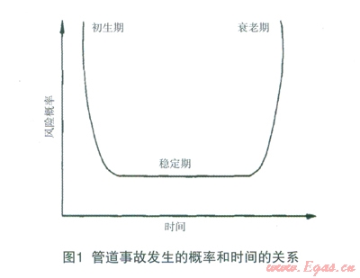 按照W.KentMuhlbauer的分類方法,造成管道失效和事故的原因共4大類:①第三方破壞。第三方破壞原因是指燃氣管道因最小埋深、地面上的活動狀況(水平)、當?shù)鼐用竦乃刭|(zhì)(公眾教育)、管道地上設(shè)備安全、線路狀況、巡線頻率等因素,這些因素以外力擠壓或人為破壞的形式使燃氣管道受到損壞。②管道腐蝕。腐蝕是導(dǎo)致燃氣管道(主要是鋼管)穿孔、破裂的重要破壞因素。對于埋地管道而言,腐蝕來自兩個方面:內(nèi)腐蝕和外腐蝕。③人工誤操作。人工誤操作包括設(shè)計誤操作、施工誤操作、技術(shù)誤操作、管理與監(jiān)督誤操作、運行維護與檢測誤操作等,這些誤操作會導(dǎo)致燃氣管網(wǎng)運行的安全性降低,風(fēng)險增加。④管網(wǎng)設(shè)計。設(shè)計需考慮的因素有管道最大承受壓力、管內(nèi)水擊因素、設(shè)計厚度和選材選型、士層移動、線路選擇、施工方案等,考慮不周會導(dǎo)致燃氣事故的發(fā)生。在實際風(fēng)險管理中,用普通的概率計算方法計算其風(fēng)險概率相當困難,有些還不可能實現(xiàn)。因此,采用美國核管理委員會(NUREG)推薦的方法,通過計算失效速率得出風(fēng)險概率。由分析統(tǒng)計的相關(guān)資料可知,管道發(fā)生事故的風(fēng)險概率一般符合U型曲線(見圖l),即初期處于磨合階段,管道工作并不穩(wěn)定,后期接近設(shè)計壽命,事故發(fā)生也較頻繁。若只考慮中間的穩(wěn)定期,則其風(fēng)險速率v可視為常數(shù)。