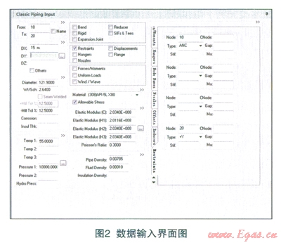數(shù)據(jù)輸入界面見圖2,CAESARⅡ應(yīng)力分析模型圖見圖3。