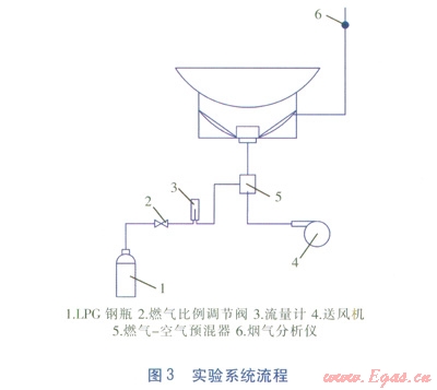 新型炒菜灶與傳統(tǒng)炒菜灶的實驗系統(tǒng)基本一致。實驗裝置包括LPG鋼瓶、煙氣分析儀、燃?xì)獗壤{(diào)節(jié)閥、流量計、電子溫度計等。煙氣分析儀用于測量煙氣中CO體積分?jǐn)?shù),燃?xì)獗壤{(diào)節(jié)閥用于調(diào)節(jié)控制LPG的流量,流量計用于計量LPG累計流量。實驗系統(tǒng)流程見圖3。