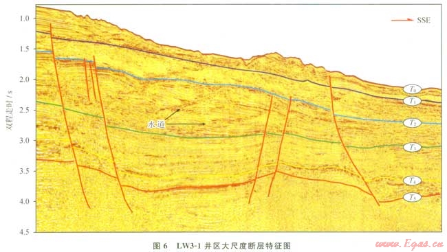 同時(shí),在LW3-1井區(qū)北部和西部發(fā)育了若干條大尺度斷層,平面上呈平行的近W—E向展布(圖3),這些斷層發(fā)育于深部的漸新統(tǒng),至上新世和更新世仍在活動(dòng)(圖6)。大尺度斷層的發(fā)育使得LW3-1井區(qū)的地層表現(xiàn)為地塹/地壘的特征(圖6)。由于大尺度斷層溝通了深部的烴源巖系,可以作為下部烴源巖向上運(yùn)移的重要疏導(dǎo)體系。通過區(qū)域上含氣層位同位素和流體包裹體的分析,也證實(shí)了大尺度斷層作為運(yùn)移通道的有效性[22]。