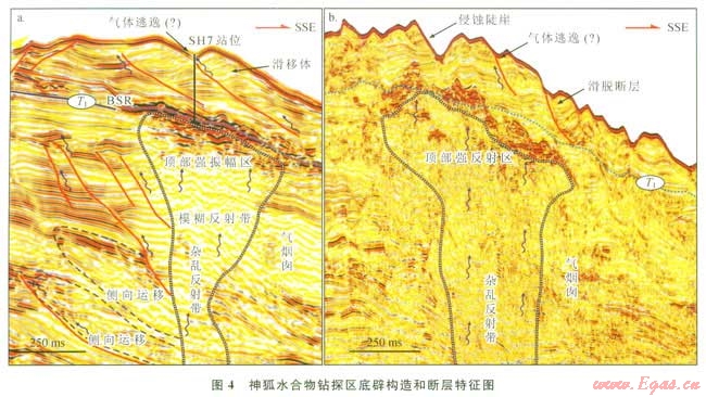 神狐水合物鉆探區(qū)內(nèi)沒有明顯的大尺度斷層,但是上新世地層中發(fā)育一些與氣煙囪相溝通正斷層(圖4-a)。這些斷層的存在為含氣流體的側(cè)向運(yùn)移提供了通道,斷層附近存在的一些雜亂反射特征可作為流體發(fā)生短距離側(cè)向運(yùn)移的證據(jù)(圖4-a)。此外,在更新世以來的地層中,鉆探區(qū)內(nèi)廣泛發(fā)育滑移沉積體(圖4-b)。在重力的誘導(dǎo)下,沉積層將順著滑脫斷層,沿著陸坡坡降的方向線由北向南發(fā)生整體的滑動(dòng)。這些滑脫斷層呈雁列式排列,通??梢詼贤鉄焽韬秃5?/span>(圖4-b)。滑脫斷層的存在一方面可以作為流體逃逸至海底的通道,另一方面也可為水合物的形成提供有限的空間,從而形成一些小規(guī)模的裂縫充填型水合物[19]。