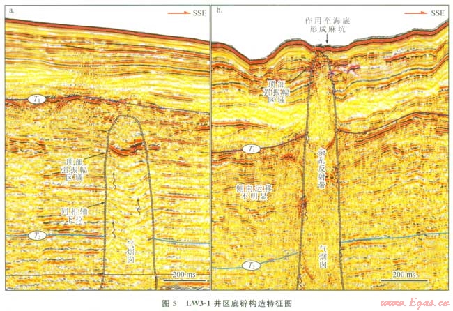 LW3-1井區(qū)的底辟構(gòu)造呈直立窄柱狀,一般不會(huì)引起周緣地層的向上牽引,且少有伴生斷層(圖5)。在這一區(qū)域的西南部發(fā)育有一個(gè)小型底辟構(gòu)造(氣煙囪),平面位置見圖3。地震剖面上可以觀察到內(nèi)部具有雜亂反射的特征,且局部存在著同相軸下拉的現(xiàn)象,這個(gè)小型的流體底辟可刺穿至海底,在海底表面可能導(dǎo)致了麻坑的形成(圖5-b)。