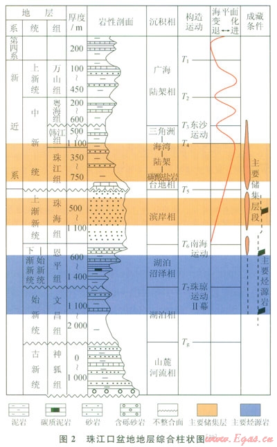 珠江口盆地是位于南海北部大陸架上的中、新生代沉積盆地。盆地呈NE方向展布,具有“三隆兩坳”的構(gòu)造格局,從北至南依次為北部斷階帶、北部坳陷帶、中央隆起帶、南部坳陷帶和南部隆起帶等5個(gè)一級(jí)構(gòu)造單元[7]。神狐水合物鉆探區(qū)和LW3-1井區(qū)均位于白云凹陷南側(cè)(圖1)。以區(qū)域“破裂不整合面——T7,界面”為界,珠江口盆地的構(gòu)造演化可劃分為兩個(gè)階段:斷裂階段和裂后階段[8]。同樣以T7界面為界,盆地垂向上構(gòu)成了下斷上坳的雙層結(jié)構(gòu)和先陸后海的沉積組合[9]。整個(gè)盆地的沉積充填為古新統(tǒng)—下統(tǒng)新統(tǒng)的沉積地層(包括神狐組、文昌組和恩平組),以及古新統(tǒng)—下漸新統(tǒng)的沉積地層(珠海組、珠江組、韓江組、粵海組和萬山組)。沉積環(huán)境也發(fā)生了由陸向海、水向深水、由過補(bǔ)償向欠補(bǔ)償?shù)难葑?/span>(圖2)。