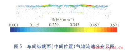 車間縱截面(中間位置)氣流流速分布云圖見(jiàn)圖5。由圖5可知,車間室內(nèi)主要工作區(qū)氣流流速為0.50~0.55m/s,相對(duì)于推薦值略高。