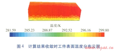 計(jì)算結(jié)果收斂時(shí)工件表面溫度分布云圖見(jiàn)圖4。由圖4可知,計(jì)算結(jié)果收斂時(shí)工件表面溫度在24~25℃,溫度分布均勻,但在工件底部出現(xiàn)了明顯的溫度梯度。筆者認(rèn)為是工件底部與地面接觸處,受輻射角系數(shù)的影響產(chǎn)生了溫度梯度。由模擬結(jié)果可知,工件表面平均溫度呈先升高后下降的趨勢(shì)。模擬開(kāi)始時(shí),以輻射板對(duì)固體工件表面的輻射作用為主,因此工件表面溫度迅速升高,達(dá)到一定溫度時(shí),工件開(kāi)始與周圍氣流發(fā)生對(duì)流換熱,溫度有所下降,直至計(jì)算結(jié)果收斂時(shí),保持在24~25℃。