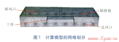在模擬計(jì)算供暖熱負(fù)荷時(shí),僅考慮3m高度以下的主要工作區(qū)域。噴涂車間冬季室外供暖計(jì)算溫度為-9.8℃,供暖室內(nèi)設(shè)計(jì)溫度為23℃,設(shè)計(jì)供暖熱負(fù)荷為442848W。選取14塊輻射板,每塊輻射板長(zhǎng)36.5m,熱水進(jìn)、出口溫度為93、73℃,總流量為19m3/h。輻射板表面溫度為47℃,單位長(zhǎng)度輻射板散熱量為867W/m,總散熱量為443100W。輻射板安裝高度為11.4m,與最長(zhǎng)的外墻平行放置,靠墻第一排輻射板距墻0.5m3。為簡(jiǎn)化計(jì)算,視每塊輻射板內(nèi)熱水分布均一,僅在流固交界面處有溫度變化。