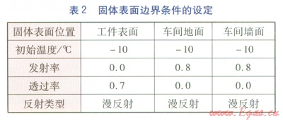 采用S2S(Surface-to-Surface)輻射換熱模型,忽略車間內(nèi)空氣對(duì)輻射板輻射能的吸收,模擬輻射板對(duì)車間內(nèi)工件、地面、墻面的熱輻射過(guò)程,以及車間內(nèi)主要的流固耦合過(guò)程。以基爾霍夫定律為基礎(chǔ),由STAR-CCM+軟件可直接計(jì)算各表面的反射率,從而進(jìn)行輻射換熱量計(jì)算。熱源(即輻射板)與各固體表面邊界條件的設(shè)定見(jiàn)表1、2。