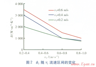 V1分別為0.2、0.4、0.6m/s時(shí),由式(1)計(jì)算得到的總換熱系數(shù)K隨穢:的變化見圖1。由圖1可知,當(dāng)v1一定時(shí),總換熱系數(shù)K隨v2的增大而增大,但增大的幅度在減小。