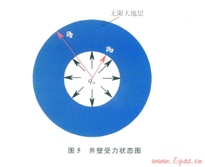 “地層 井眼”模型如圖5。地層可看作是半徑無窮大的圓,由圣維南原理[22]可知:無窮大地層半徑遠(yuǎn)大于井眼半徑,因此由井壁應(yīng)力對(duì)無窮遠(yuǎn)處的總應(yīng)力擾動(dòng)是很小的,可以不計(jì)。由于水泥漿未凝固,故井壁僅受水泥漿液柱壓力(qo)的內(nèi)壓作用。