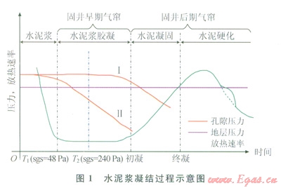 隨著水化反應(yīng)的進(jìn)行,液態(tài)水泥漿逐漸凝固成固態(tài)水泥石需經(jīng)歷液相、膠凝、凝固和硬化等4個(gè)階段[15](圖1)。液態(tài)水泥漿能夠完全傳遞孔隙壓力,不會(huì)發(fā)生氣竄;膠凝態(tài)水泥漿不斷形成膠凝結(jié)構(gòu),發(fā)生塑性體積收縮,引起孔隙壓力逐漸降低;初凝后,水泥漿進(jìn)入凝固、硬化階段,表現(xiàn)出固態(tài)特征,滲透率極低,能有效阻止水泥環(huán)本體氣竄[16-17]。南上述研究分析可知,固井早期氣竄包括兩個(gè)階段:靜膠凝強(qiáng)度過渡時(shí)間(T1至T2);靜膠凝強(qiáng)度過渡時(shí)間結(jié)束時(shí)刻至初凝(T2至初凝)。