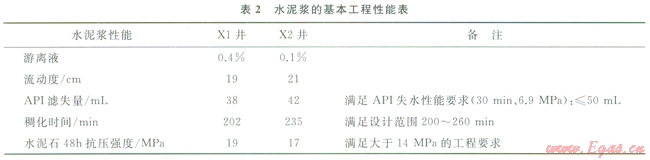 已知X區(qū)塊兩口天然氣井Xl和X2。XJ井:Æ177.8mm(內(nèi)徑157.1mm)油層尾管下深5085m,井眼直徑215.9mm,鉆井液密度為2.30g/cm3,采用高密度(2.35g/cm3)水泥漿固井,水固比0.263,封固井段4400~5085m,水泥漿實(shí)驗(yàn)設(shè)計(jì)溫度為110℃;X2井:Æ127mm油層尾管懸掛固井,井眼直徑149.2mm,鉆井液密度為2.10g/cm3,采用密度為2.13g/cm3水泥漿固井,水固比0.364,封固井段4862~5731m,水泥漿實(shí)驗(yàn)設(shè)計(jì)溫度為120℃。已知該區(qū)地層壓力梯度為0.0225MPa/m,油層套管彈性模量為206.9GPa、泊松比0.3,地層巖石彈性模量為13.84GPa、泊松比0.287。X1、X2兩井水泥漿基本工程性能滿足現(xiàn)場(chǎng)施工要求(表2)。