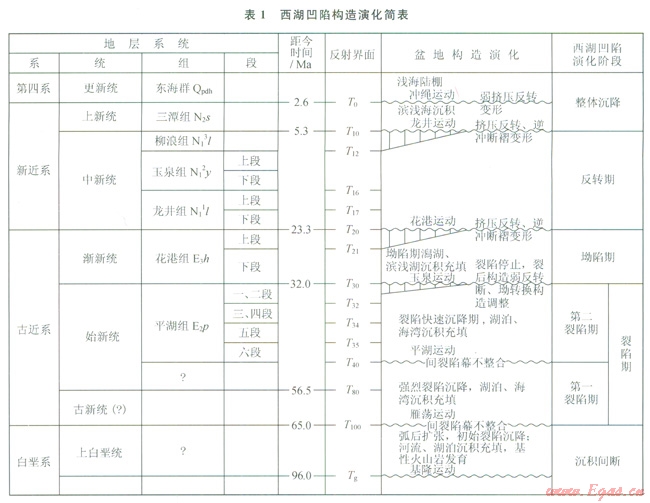西湖凹陷以新生代碎屑沉積為主,凹陷中心最大沉積厚度可超過15000m。自下而上依次發(fā)育始新統(tǒng)平湖組以下地層(由于缺少鉆井、測井、同位素、古生物等資料,地層屬性尚難確定一古新統(tǒng)?)、古近系始新統(tǒng)平湖組(E2p)、漸新統(tǒng)花港組(E3h)、新近系中新統(tǒng)龍井組(N11l)、中新統(tǒng)玉泉組(N12y)、中新統(tǒng)柳浪組(N13l)、上新統(tǒng)三潭組(N2s)以及第四系的東海群(Qpdh)(表1)。