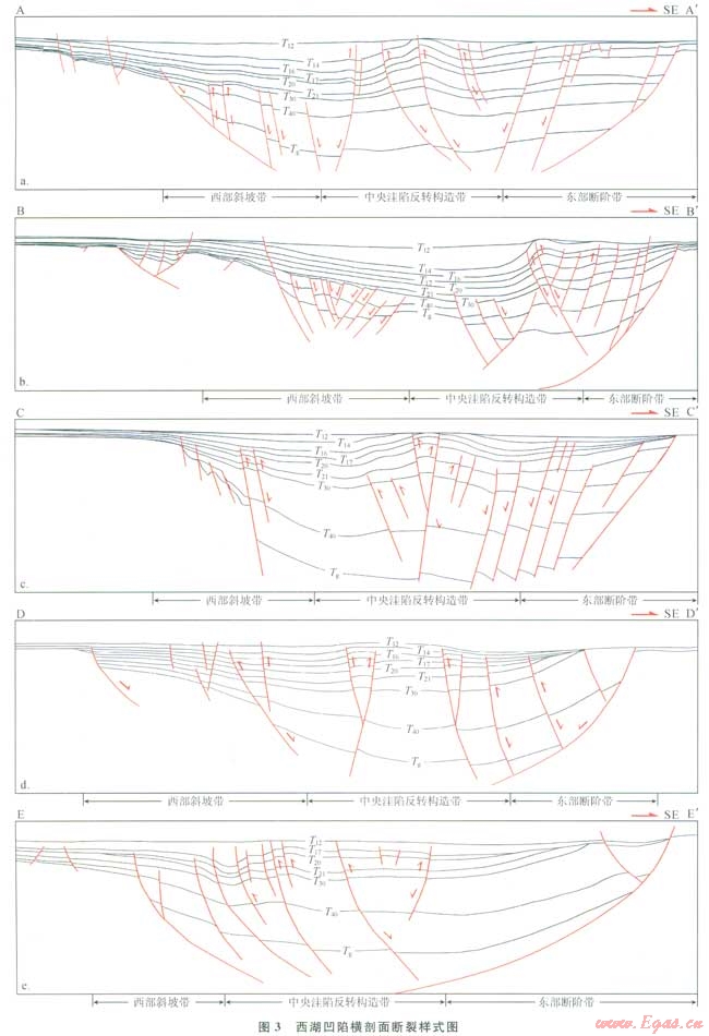 1)在斷裂空間分布上,西湖凹陷新生界發(fā)育下、中、上3個斷裂系統(tǒng):下部斷裂系統(tǒng)主要發(fā)育在古新統(tǒng)始新統(tǒng)構(gòu)造層,為基底卷入型張性正斷層;中部斷裂系統(tǒng)主要發(fā)育在漸新統(tǒng) 中下中新統(tǒng)構(gòu)造層,為擠壓型斷裂;上部斷裂系統(tǒng)主要發(fā)育在上中新統(tǒng)第四系構(gòu)造層,為張扭型斷裂,斷裂走向為近E—W向。各層次斷裂系統(tǒng)中斷裂組合樣式具有顯著的差異:下部張性斷裂系統(tǒng)主要有斷階型、多米諾型、地塹、地壘等斷裂組合樣式,多與構(gòu)造部位有關(guān);中部壓性斷裂系統(tǒng)主要有正“Y”、反“Y”字形和簡單后沖型斷裂組合樣式,多與其所處部位的反轉(zhuǎn)強(qiáng)度有關(guān);上部張剪性剖面上為懸掛斷裂,平面上呈條帶狀和雁行狀組合。