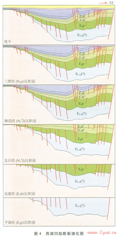 4)晚中新世至第四紀(jì),斷裂活動基本停止,僅在南北向剖面上發(fā)育部分張剪性斷層,斷層對地層的控制作用不顯著,該時期為西湖凹陷的整體沉降期。