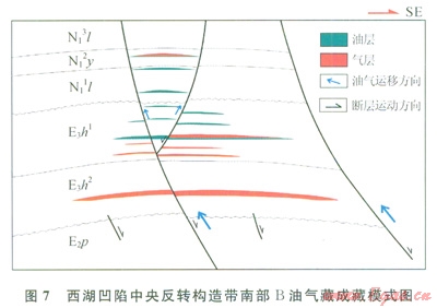 在中央反轉(zhuǎn)構(gòu)造帶南部花港組下段,近E—W向斷層與NE向斷層多有分布,2套斷層共存的過渡層段厚度可達(dá)1000m,既可以通過下部斷層作為油氣運(yùn)移通道獲得油氣,又可在上、下部斷層的末端,即應(yīng)力衰退區(qū)有利于油氣聚集成藏。幕式的斷層活動或新的斷層活動,也提供了油氣從下部成熟烴源巖體中排出和運(yùn)移的動力。