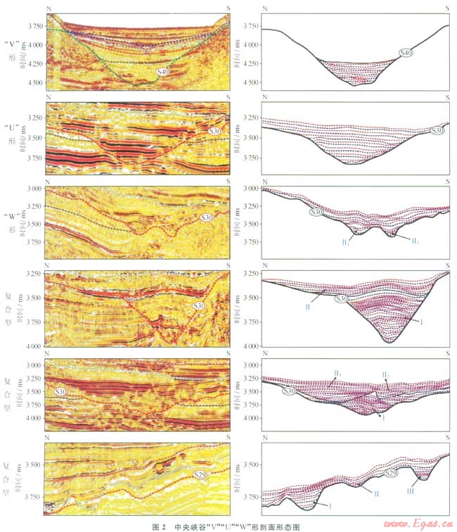 瓊東南盆地經(jīng)歷了由陸到海的地質(zhì)演化過程,期間伴隨發(fā)育有多種類型的儲(chǔ)集體:水道砂、低位扇、海底扇、生物礁、濱海砂壩、三角洲、古潛山等。其中以中新世黃流期發(fā)育于整個(gè)深水區(qū)中央坳陷帶內(nèi)的中央峽谷水道砂儲(chǔ)集體,特征最明顯。中央峽谷西起鶯歌海盆地東部陸坡,向東終止于南海西北次海盆,總長度425km,寬度最大處為48.5km。其整體呈SW—NE走向,平面上呈“S”形展布,并具有“分段性”特征,由西至東可劃分為樂東段、陵水段、松南寶島段和長昌段(圖1),剖面上呈對稱或不對稱的“V”“U”和“W”形態(tài)[6-7](圖2)。受多種地質(zhì)因素的共同控制,中央峽谷內(nèi)部充填結(jié)構(gòu)具有“多期次性”。充填了相互疊置的多套有利的砂泥巖儲(chǔ)蓋組合,并依靠峽谷邊界側(cè)封和巖性尖滅形成多個(gè)構(gòu)造+巖性圈閉,具有極大的勘探潛力。