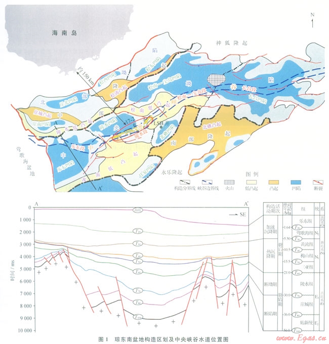 瓊東南盆地位于中國南海北部大陸邊緣,為新生代斷陷—坳陷盆地。具有準(zhǔn)被動(dòng)大陸邊緣盆地構(gòu)造特征,平面上則表現(xiàn)為南北分帶特征,由北至南可劃分為:北部坳陷、中部隆起、中央坳陷與南部隆起(圖1)。甕地經(jīng)歷由陸到海的演化過程,經(jīng)歷了斷陷期(T100—T70)、斷坳期(T70—T60)、熱沉降期(T60—T30)、加速沉降期(T30—現(xiàn)今)4個(gè)階段,整體可劃分為裂陷期(T100—T60)與裂后期(T60—現(xiàn)今)兩個(gè)時(shí)期,其絕對地質(zhì)年代如圖1所示,沉積了巨厚的新生代地層,厚度大于12000m[1-3]。