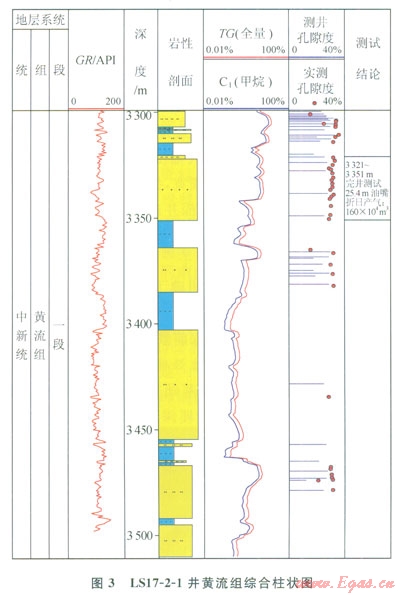LS17-2-1井于2014年8月18日在新近系上中新統(tǒng)黃流組一段3321~3351m井段進(jìn)行試油,用25.4mm油嘴求產(chǎn),日產(chǎn)氣160×104m4、凝析油78m4,出于海上安全的考慮,沒有進(jìn)一步放大油嘴測試。測試結(jié)果表明,氣壓穩(wěn)定,地層能量充足。中海油于2014年9月15日對外公布了上述成果。