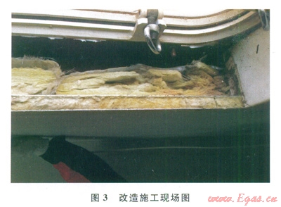 海上固定平臺長期受潮濕、日照、腐蝕等因素影響[13],使平臺生活樓房間墻壁原有隔聲效果降低。為更好的阻礙空氣噪聲及振動噪聲的傳播,針對房間的墻壁提出改造處理。生活樓房間的吸隔聲內(nèi)墻壁如圖1所示,墻壁的隔聲效果不佳。對于該類房間的墻壁,選用符合中國船級社規(guī)定的吸隔聲材料,如圖2所示。對于噪聲超標(biāo)代表性房間進(jìn)行現(xiàn)場施工改造,改造現(xiàn)場圖如圖3所示。