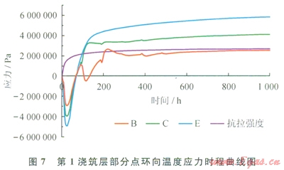 圖7為第l澆筑層部分點(diǎn)環(huán)向溫度應(yīng)力時(shí)程曲線。由圖7可知,在外罐施工期間,混凝土先受壓后受拉,在混凝土澆筑68h后,混凝土由受壓狀態(tài)轉(zhuǎn)變?yōu)槭芾瓲顟B(tài),在混凝土澆筑120h后,第1澆筑層底部某點(diǎn)所受拉應(yīng)力超過(guò)了混凝土的抗拉強(qiáng)度,底部混凝土開(kāi)始產(chǎn)生溫度裂縫。B點(diǎn)應(yīng)力曲線存在上下波動(dòng)是由于B點(diǎn)易受上層新澆筑混凝土的影響;比較B、C、E點(diǎn)應(yīng)力時(shí)程曲線可知,混凝土離罐底越近,產(chǎn)生的溫度應(yīng)力越大。