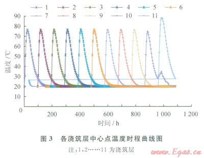 混凝土的內(nèi)部溫度與水泥種類(lèi)、水灰比、初始條件、邊界條件、熱傳導(dǎo)系數(shù)等有關(guān),還與位置、時(shí)間有關(guān),有限元分析時(shí)采用式(1)對(duì)早齡期混凝土內(nèi)部的溫度場(chǎng)進(jìn)行求解,各澆筑層中心點(diǎn)溫度時(shí)程曲線如圖3所示。